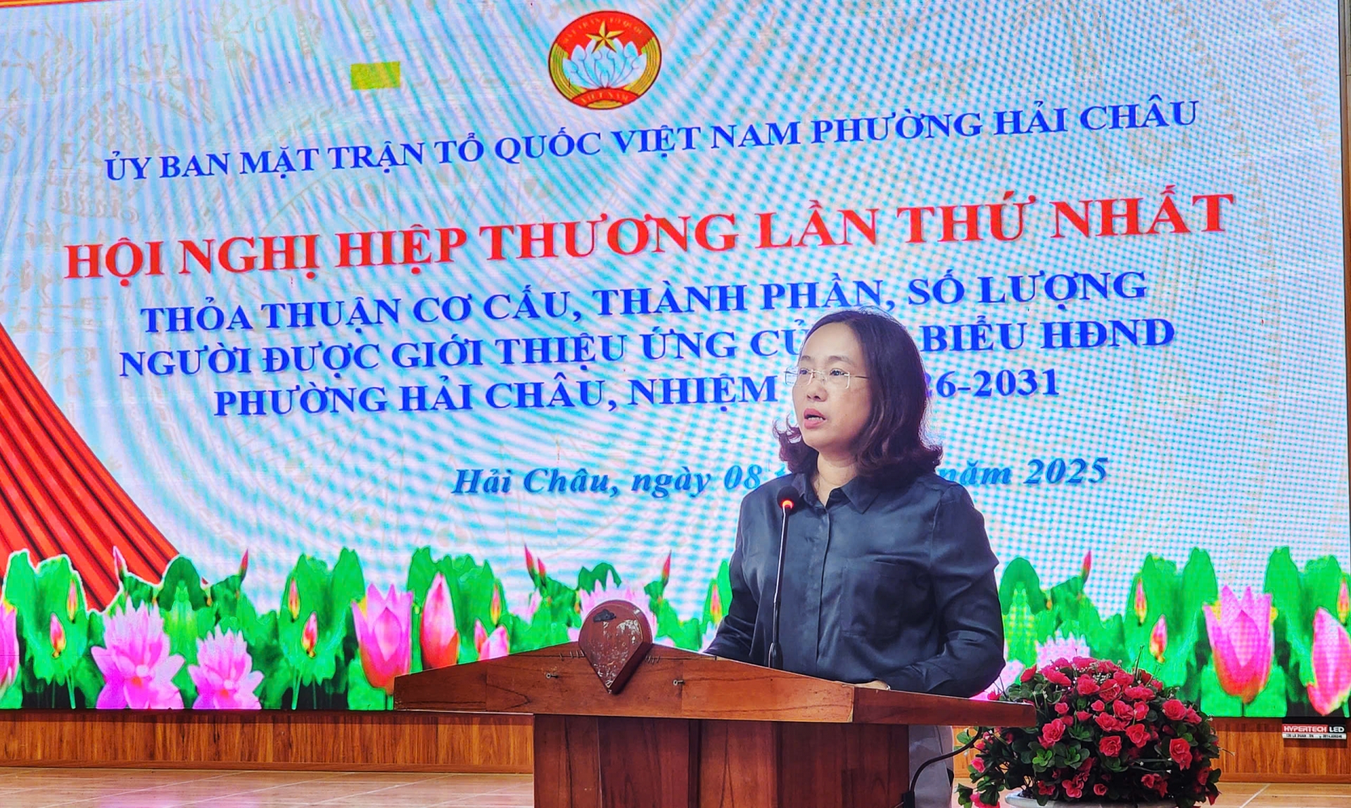 Bà Dương Ngọc Phượng thay mặt Ban Thường trực UBMT Tổ quốc Việt Nam phường trình bày Tờ trình dự kiến cơ cấu, thành phần, số lượng người được giới thiệu ứng cử đại biểu HĐND phường Hải Châu, nhiệm kỳ 2026-2031.
