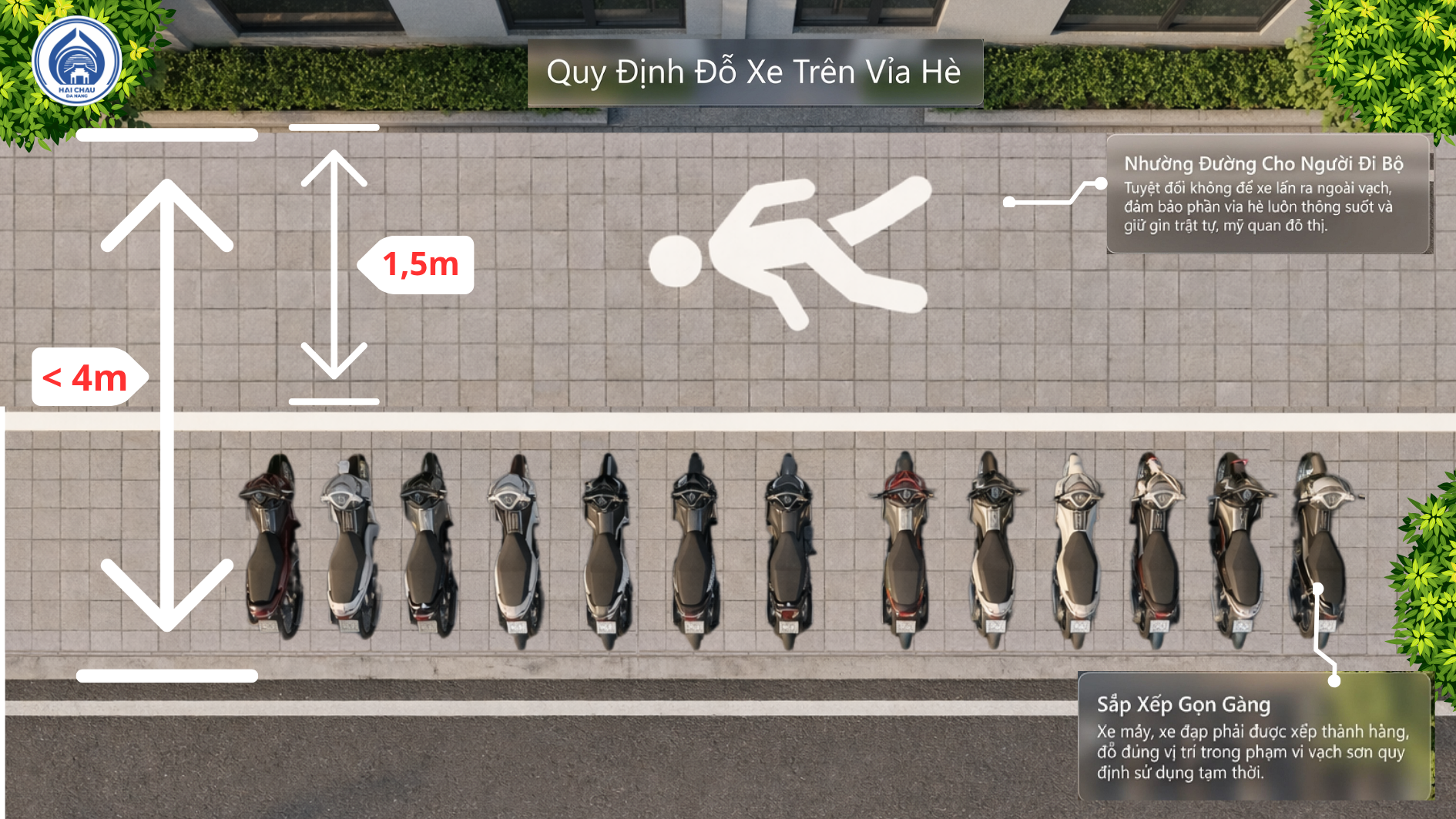 Thực hiện Kế hoạch 109 của UBND thành phố Đà Nẵng về bảo đảm trật tự đô thị, UBND phường Hải Châu đã ban hành quy định chi tiết về việc phân định và sử dụng vỉa hè trên các tuyến đường, đặc biệt đối với khu vực có bề rộng vỉa hè dưới 4m.