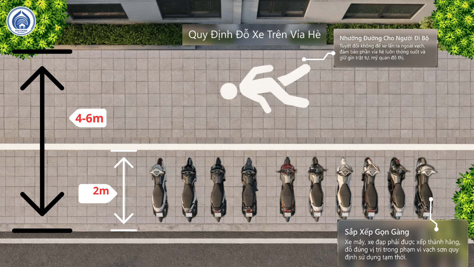 Nhằm tiếp tục triển khai Kế hoạch 109 của UBND thành phố Đà Nẵng về bảo đảm trật tự đô thị, UBND phường Hải Châu đã quy định cụ thể phương án sử dụng đối với các tuyến vỉa hè có bề rộng từ 4m đến dưới 6m.