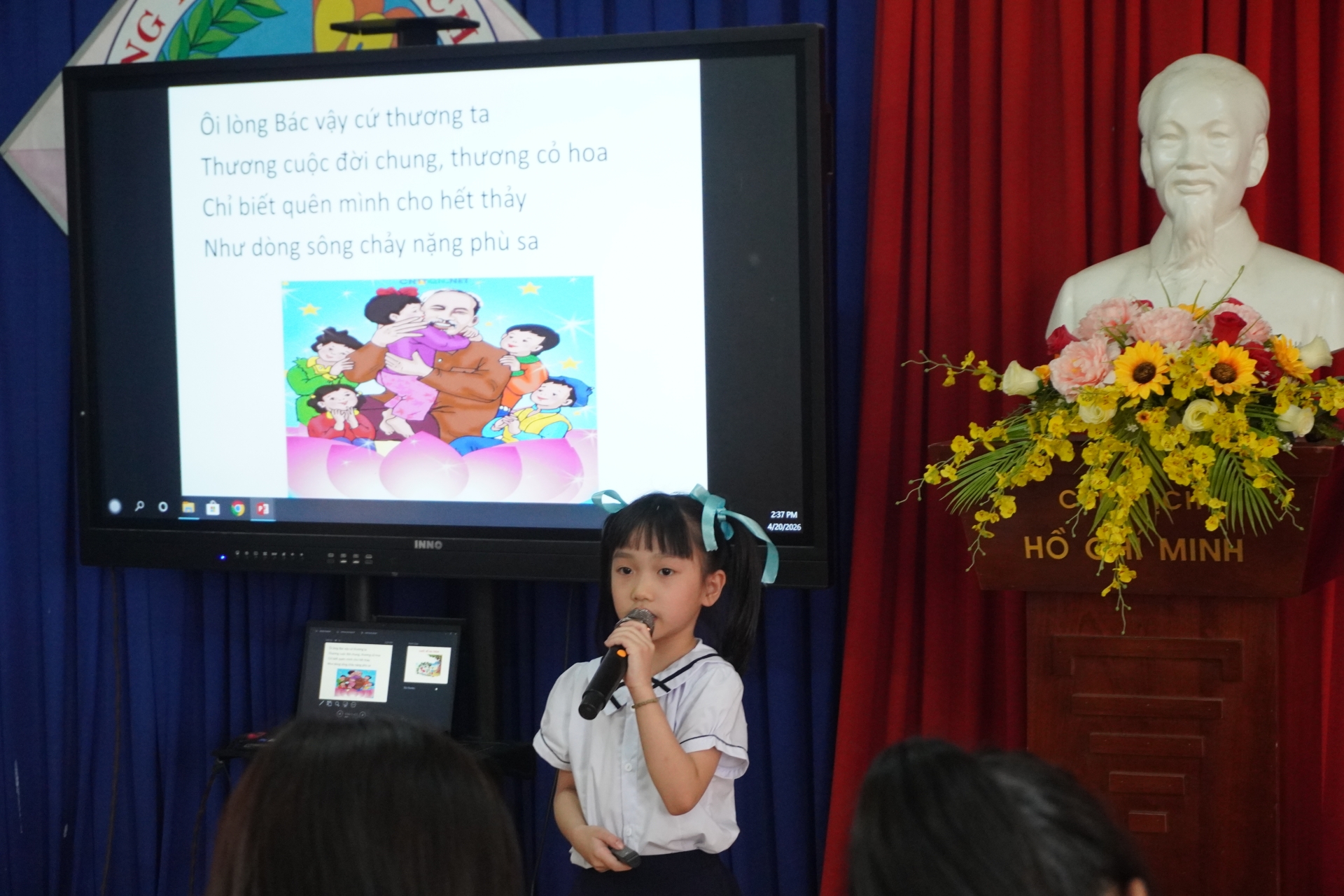 Điểm nhấn của chương trình là các phần thi và trải nghiệm kết hợp giữa đọc sách truyền thống và công nghệ hiện đại. Học sinh khối 1, 2 thể hiện khả năng kể chuyện qua tranh bằng trình chiếu PowerPoint, vừa kể vừa tương tác với hình ảnh sinh động. Ở khối 3 và 4, các em thiết kế poster giới thiệu sách, sau đó chụp ảnh, số hóa sản phẩm và trình chiếu trên màn hình, kết hợp thuyết minh ngắn gọn, sáng tạo. Đặc biệt, học sinh khối 5 với phần thi “Đại sứ Văn hóa đọc” đã ứng dụng video, slide, hình ảnh số để giới thiệu sách, thể hiện tư duy phản biện và kỹ năng thuyết trình ấn tượng.