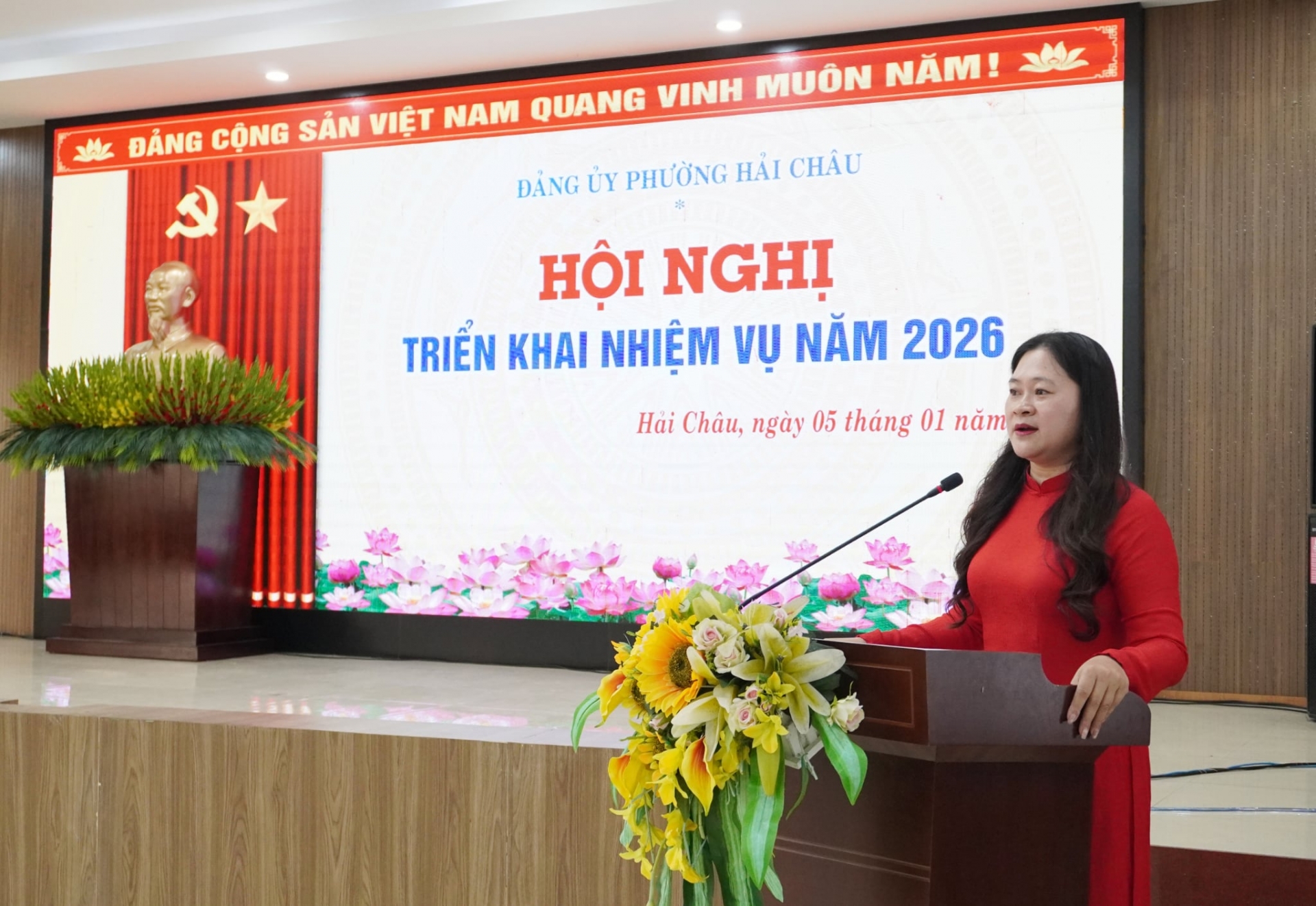 Tượng Chủ tịch Hồ Chí Minh được đặt trang trọng tại Hội trường Đảng uỷ phường Hải Châu. Đồng chí Cao Thị Huyền Trân phát biểu tại hội nghị.