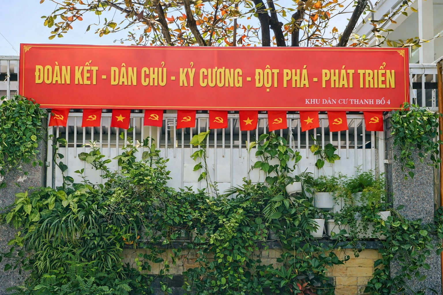 Tại khu dân cư Thanh Bồ 4, công trình trang trí treo cờ Tổ quốc, băng rôn, khẩu hiệu kết hợp trồng và chăm sóc cây xanh đã được triển khai, tạo nên một điểm nhấn rực rỡ, trang trọng trong khu dân cư. Không gian sinh hoạt chung được chỉnh trang khang trang, góp phần lan tỏa niềm tin, niềm tự hào của Nhân dân hướng về Đại hội Đảng toàn quốc lần thứ XIV.