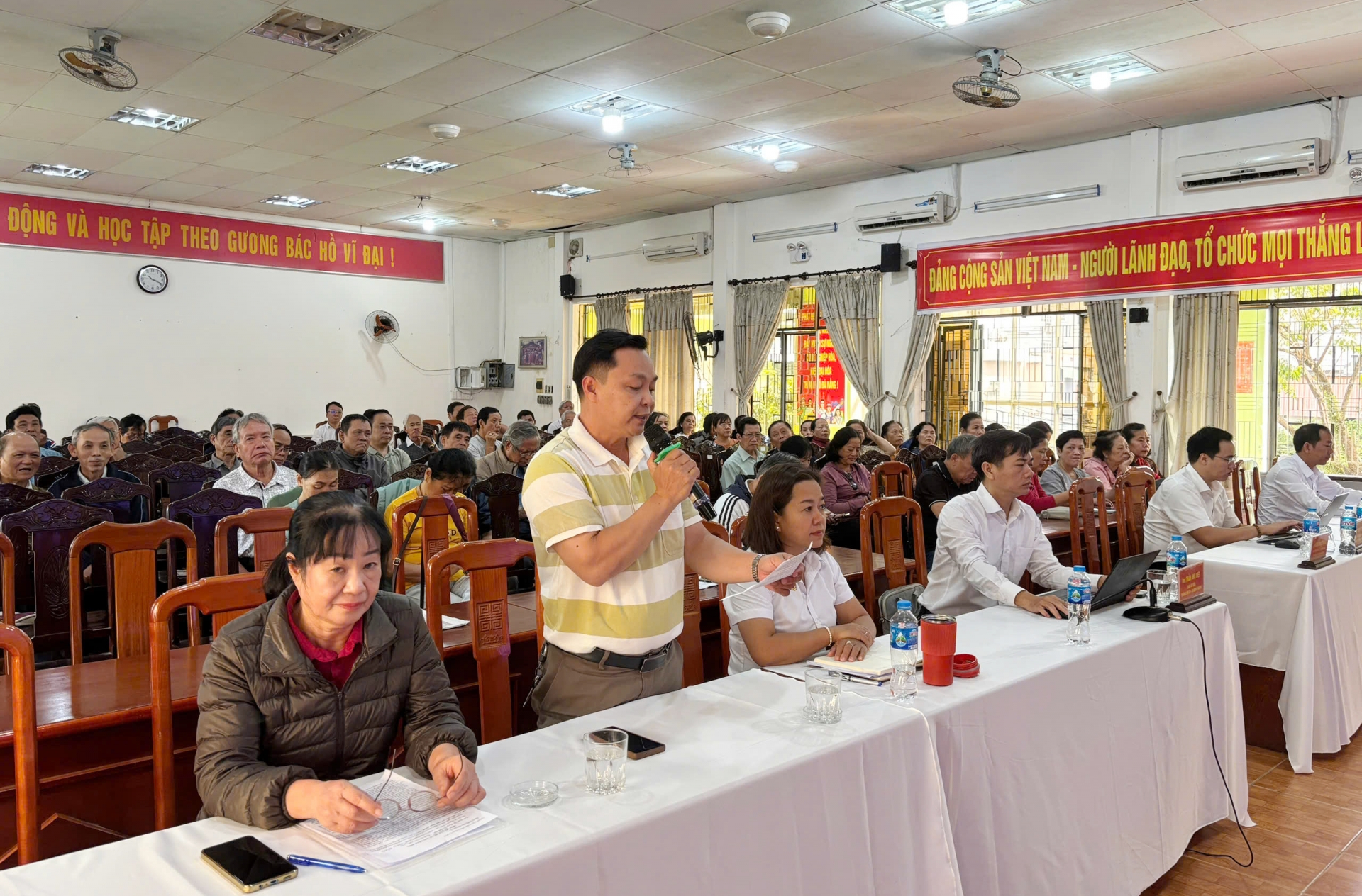UBND phường và Ban Thường vụ Đảng uỷ phường đã có báo cáo đề xuất với Ban Thường vụ Thành ủy, HĐND, UBND thành phố về việc xin điều chỉnh mục đích sử dụng một số cái tài sản công sau sáp nhập mà chưa có mục đích sử dụng để ưu tiên bố trí vào các mục đích là y tế, văn hóa, giáo dục. Khi thành phố thống nhất chủ trương, phường sẽ triển khai ngay các bước tiếp theo và thông báo rộng rãi đến cử tri.Về tình hình an ninh trật tự và môi trường, lãnh đạo phường ghi nhận lo lắng của người dân. Công an phường và các lực lượng chức năng đã báo cáo cụ thể và cam kết tiếp tục ra quân thường xuyên, xử lý tình trạng lấn chiếm vỉa hè, mất trật tự đô thị, vi phạm môi trường cũng như kiểm tra đột xuất khi có phát sinh.