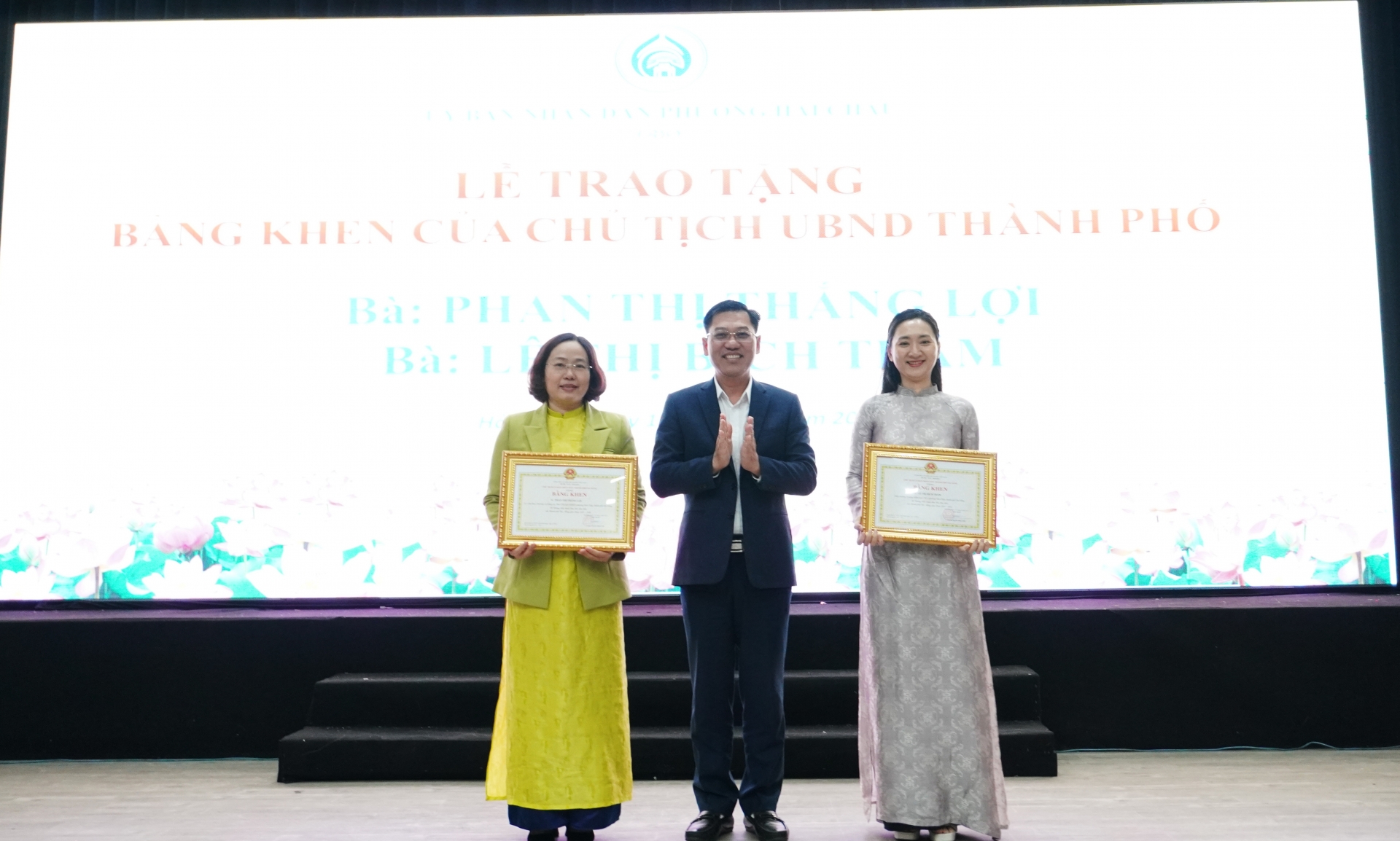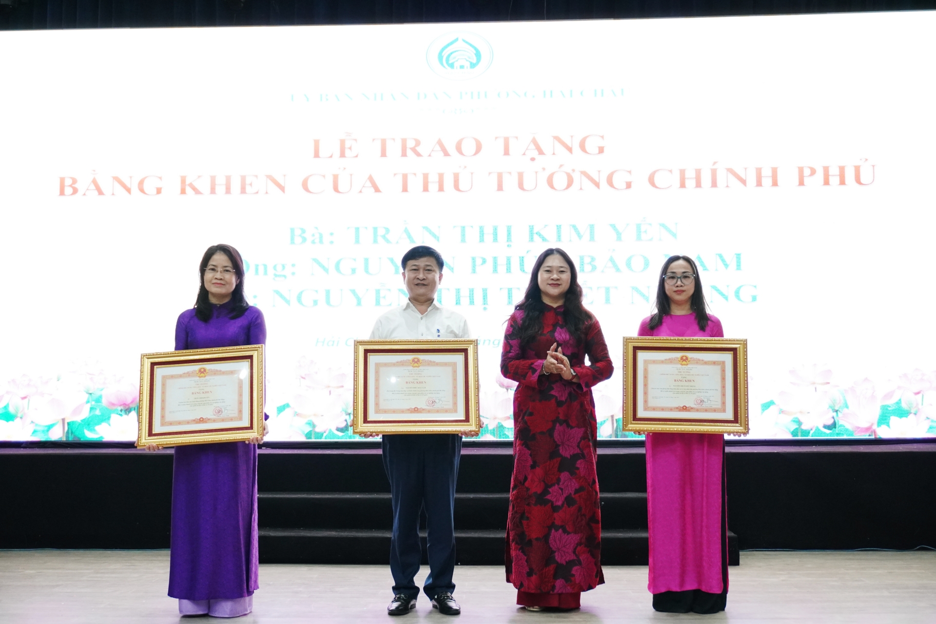 Bà Cao Thị Huyền Trân - Thành ủy viên, Bí thư Đảng ủy, Chủ tịch HĐND lâm thời phường thừa ủy quyền của Thủ tướng Chính phủ lên tặng Bằng khen của Thủ tướng Chính phủ cho 3 cá nhân thuộc UBND phường Hải Châu đã có nhiều thành tích trong công tác, góp phần vào sự nghiệp xây dựng chủ nghĩa xã hội và bảo vệ Tổ quốc.