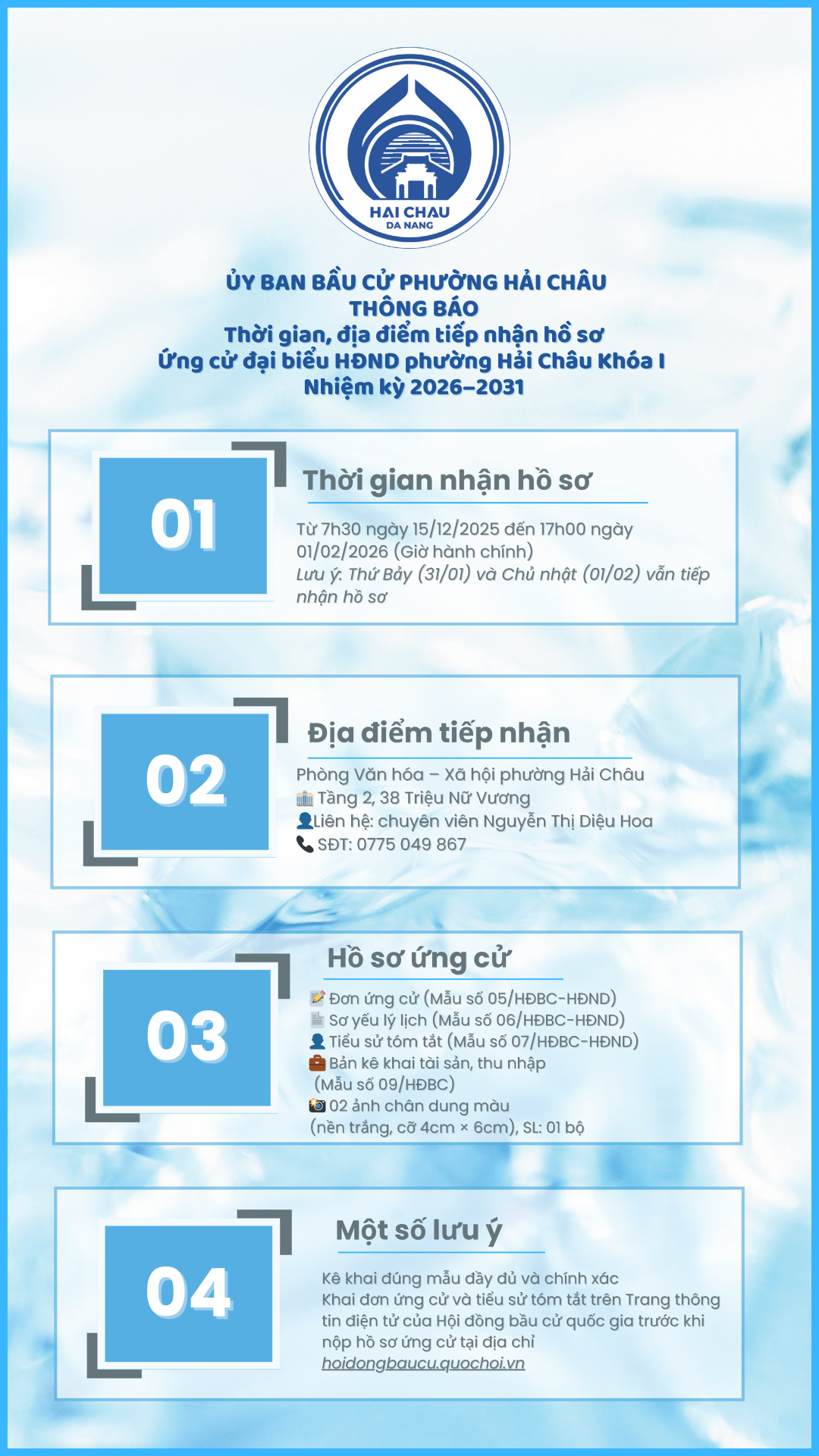 Ủy ban bầu cử phường Hải Châu đã có văn bản thông báo về thời gian, địa điểm tiếp nhận hồ sơ ứng cử đại biểu HĐND phường Hải Châu khoá I, nhiệm kỳ 2026-2031: