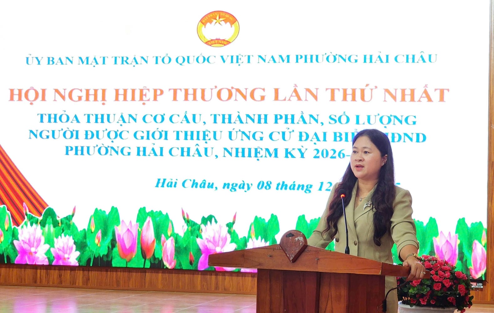 Bà Dương Ngọc Phượng thay mặt Ban Thường trực UBMT Tổ quốc Việt Nam phường trình bày Tờ trình dự kiến cơ cấu, thành phần, số lượng người được giới thiệu ứng cử đại biểu HĐND phường Hải Châu, nhiệm kỳ 2026-2031.